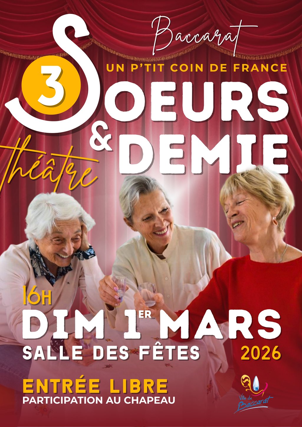 Le service culturel a le plaisir d’accueillir à nouveau l’association « Un p’tit coin de France », déjà venue à Baccarat il y a quelques années, pour une nouvelle représentation théâtrale. La troupe revient avec « 3 sœurs et demi », une comédie écrite par France WAGNER.
